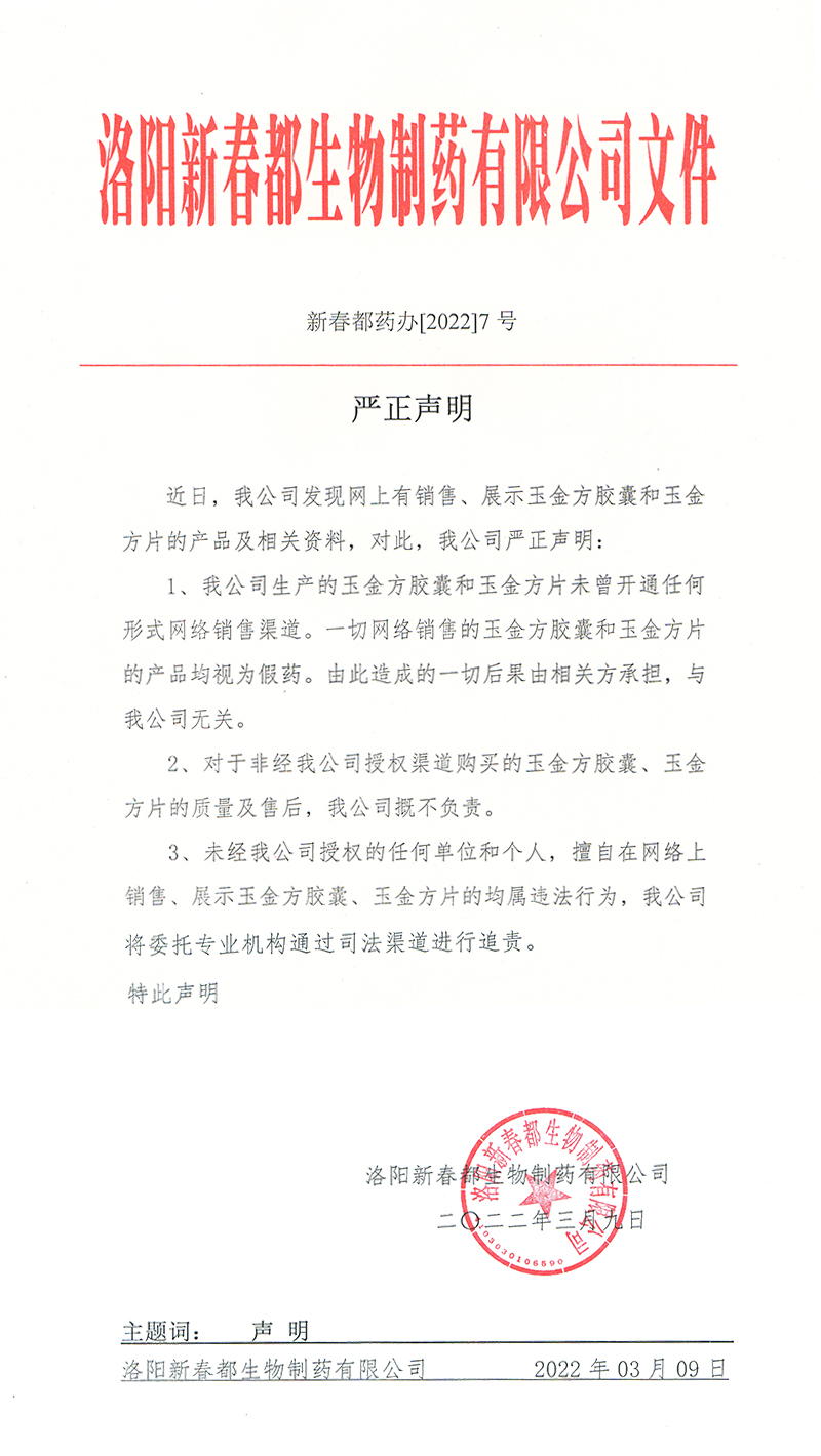 【概要描述】我公司生產(chǎn)的玉金方膠囊和玉金方片未曾開通任何形式網(wǎng)絡(luò)銷售渠道。一切網(wǎng)絡(luò)銷售的玉金方膠囊和玉金方片的產(chǎn)品均視為假藥。由此造成的一切后果由相關(guān)方承擔(dān),與我公司無關(guān)。